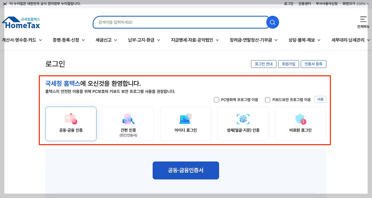 - 공동인증서 또는 간편 인증(카카오, 네이버 등)으로 로그인 가능합니다.