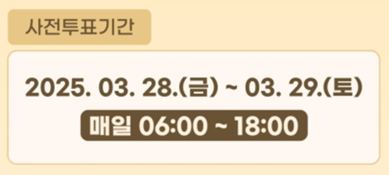 - 사전투표일: 2025년 3월 28일(금) ~ 3월 29일(토), 오전 6시 ~ 오후 6시