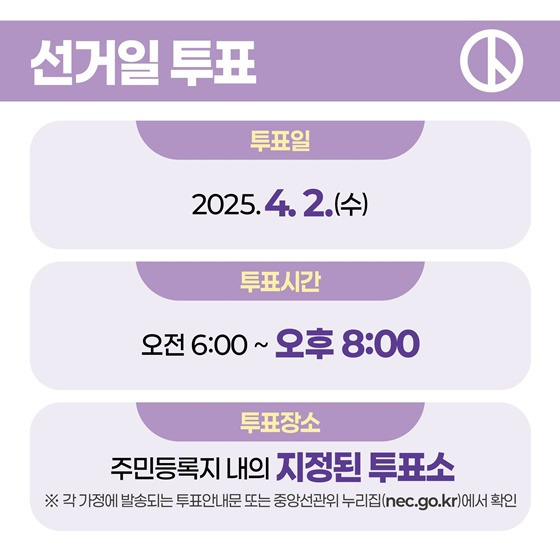 - 본투표일: 2025년 4월 2일(수), 오전 6시 ~ 오후 8시